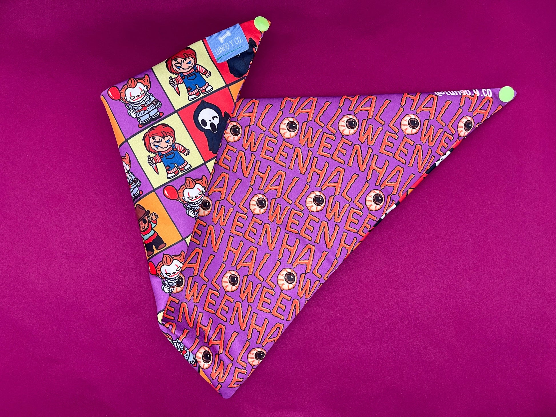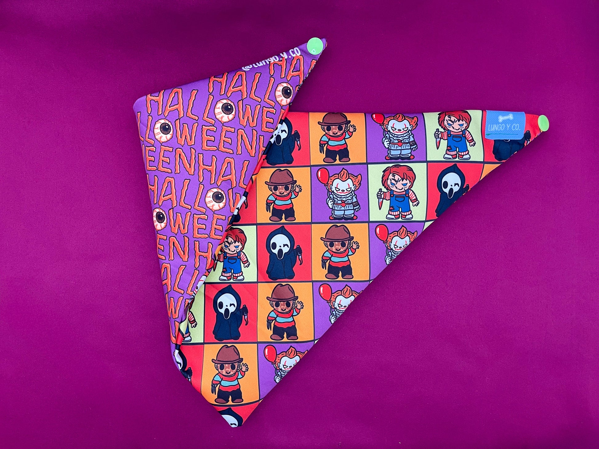 Bandana doble vista. Por un lado fondo morado brillante con la palabra "halloween" por todos lados; por el otro lado cuadros de diferentes colores con personajes icónicos de películas de terror.