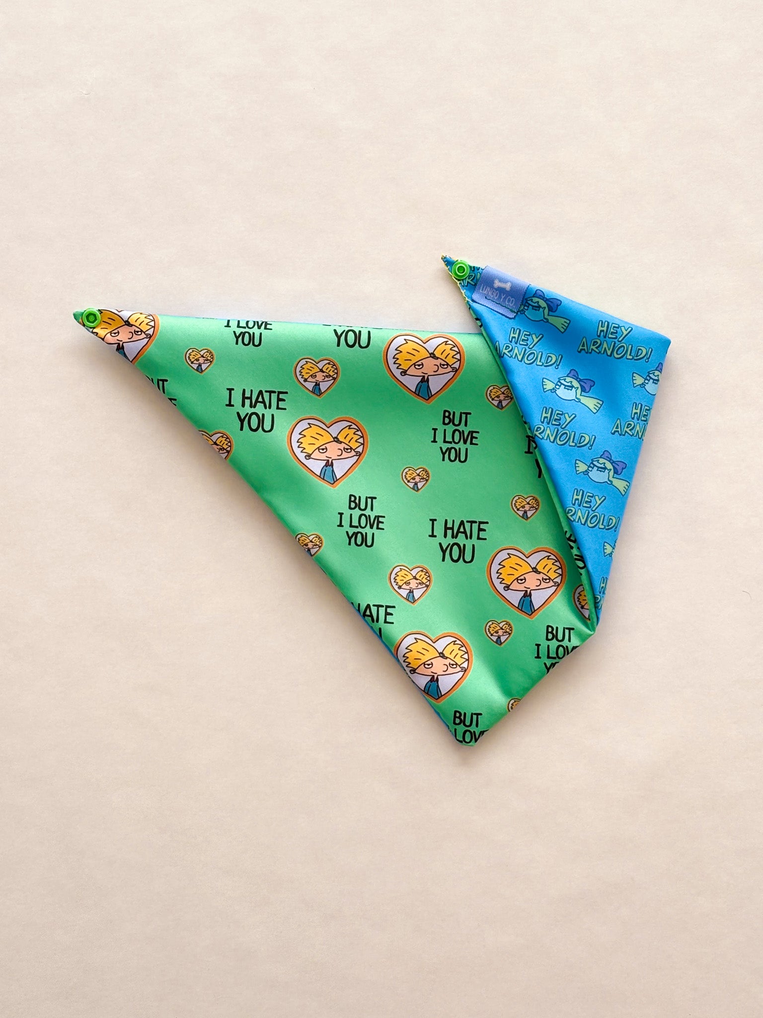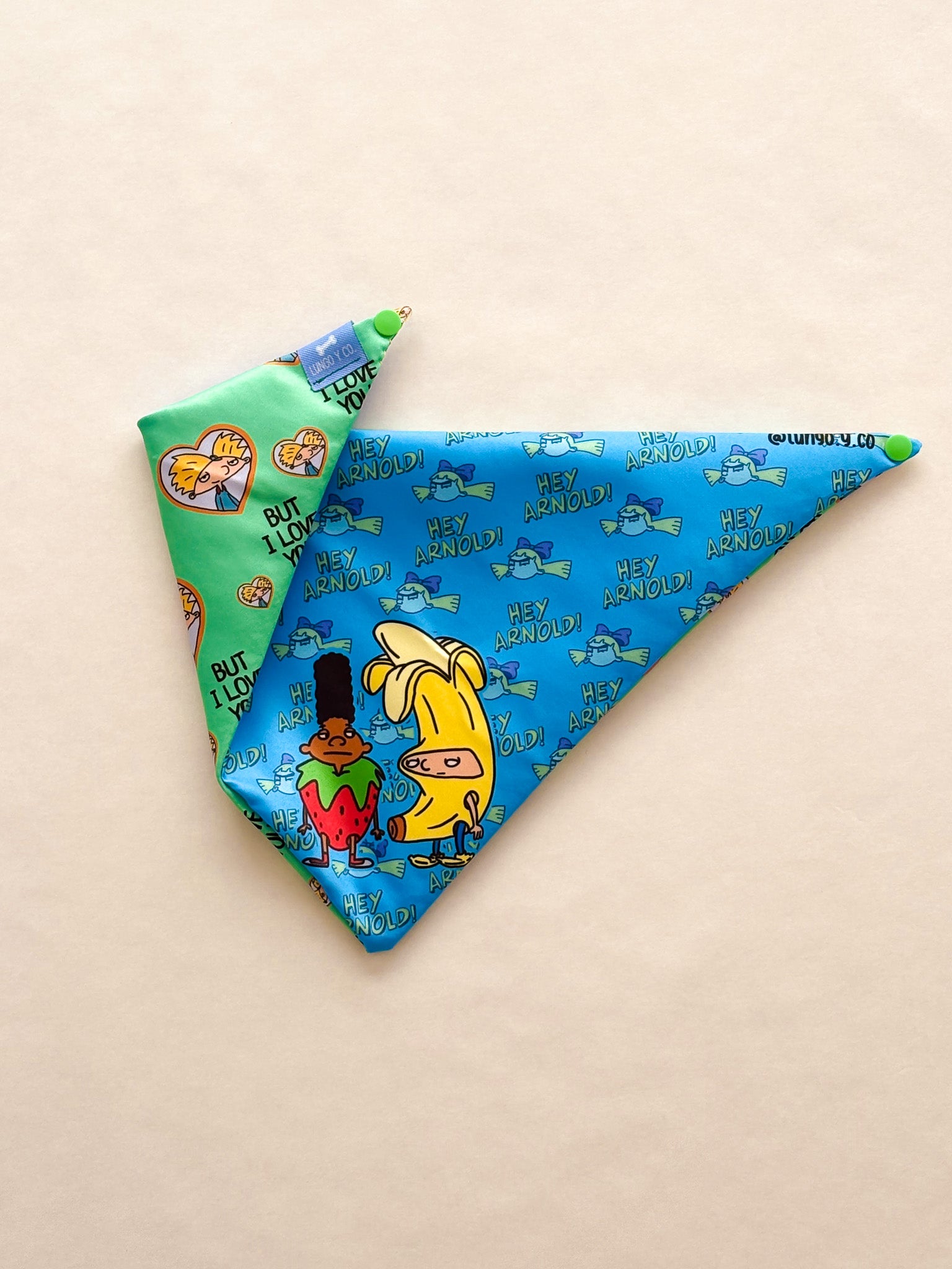 Bandana doble vista con ilustraciones relacionadas a una caricatura muy famosa de los 90´s que trata de las aventuras de un niño con cabeza de balón que vive con sus abuelos.